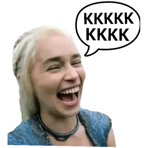 Daenerys Targaryen, de Game of Thrones, ri com um discurso 'KKKKK KKKK'. Ela tem cabelos brancos e usa um colar.
