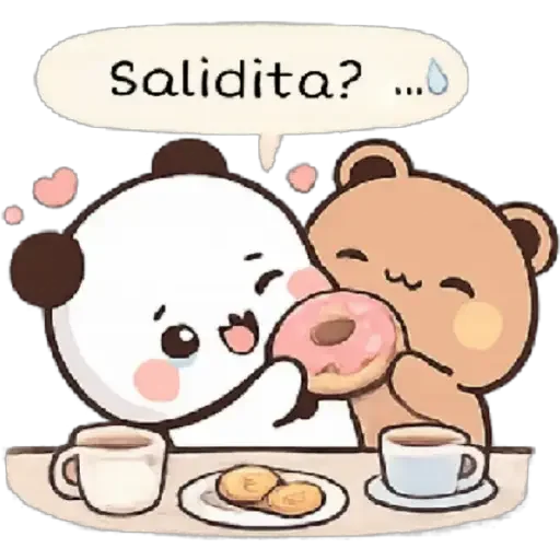 Dois ursinhos fofos sentados à mesa com xícaras de café e donuts. Um urso branco e um marrom com expressão de carinho, o marrom segurando um donut rosa. A fala 'Salidita?' aparece acima deles.