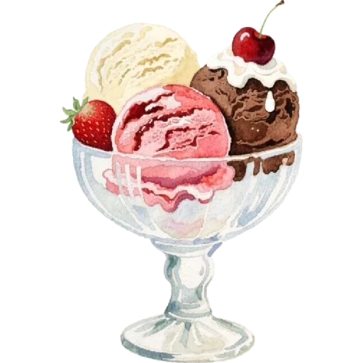 Sorvete em uma taça de vidro com três bolas de sabores diferentes: rosa, bege e chocolate, decorado com uma cereja e morangos.