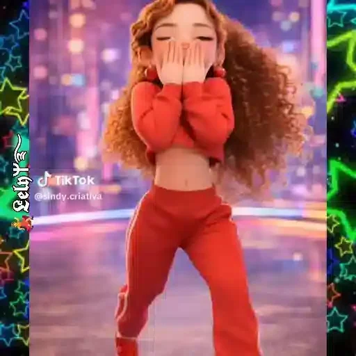 Uma personagem de anime com cabelo castanho e longo, vestida com um conjunto vermelho, fazendo uma pose de dança em um…