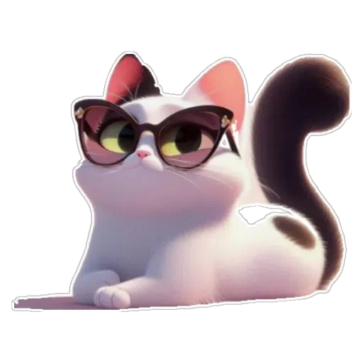 Gato branco com óculos de sol e cauda preta, deitado e olhando para o lado.