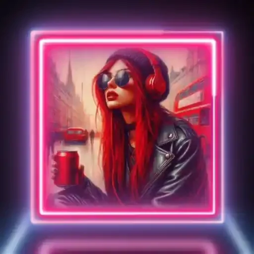 Mulher com cabelos vermelhos longos, óculos de sol e fones de ouvido, segurando uma xícara vermelha em um ambiente urbano com iluminação neon.