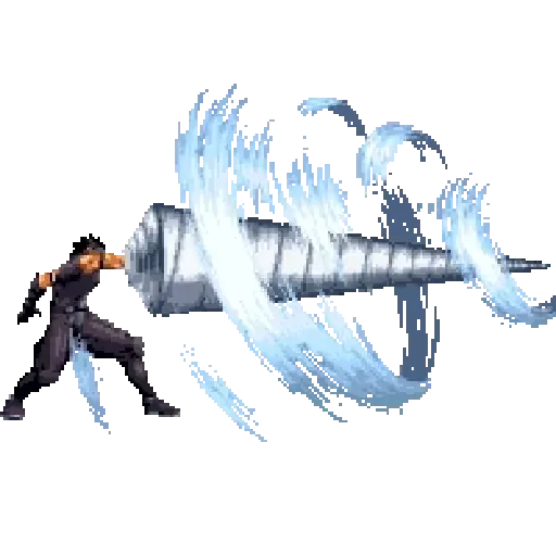 Um personagem de anime com cabelo preto e roupas pretas está fazendo um gesto de ataque com uma grande arma prateada que emite chamas azuis.