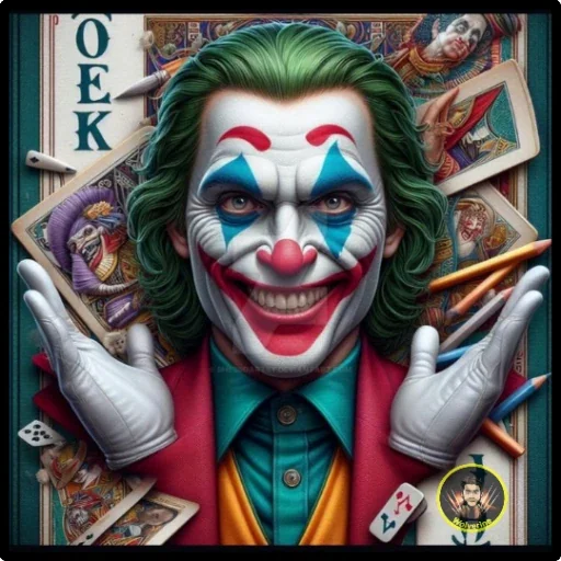 O Coringa com maquiagem colorida no rosto, cabelo verde e um sorriso malicioso, usando um terno vermelho e verde. Cartas de baralho e outros itens ao fundo.