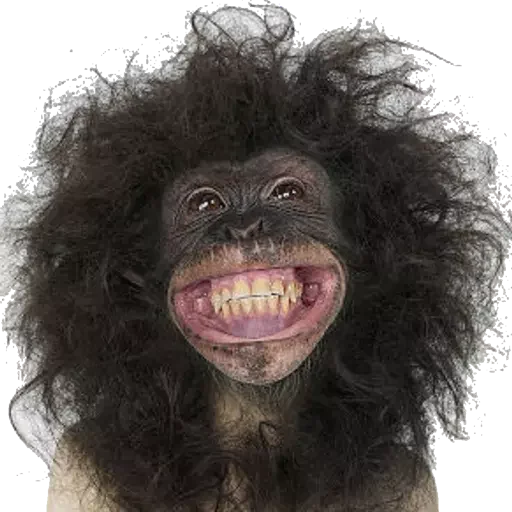 Um macaco com cabelo preto e desgrenhado, mostrando os dentes e uma expressão engraçada.