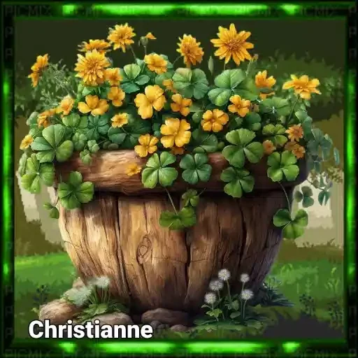 Uma plantadeira de madeira com flores amarelas e folhas verdes, com o nome 'Christianne' no canto inferior esquerdo.