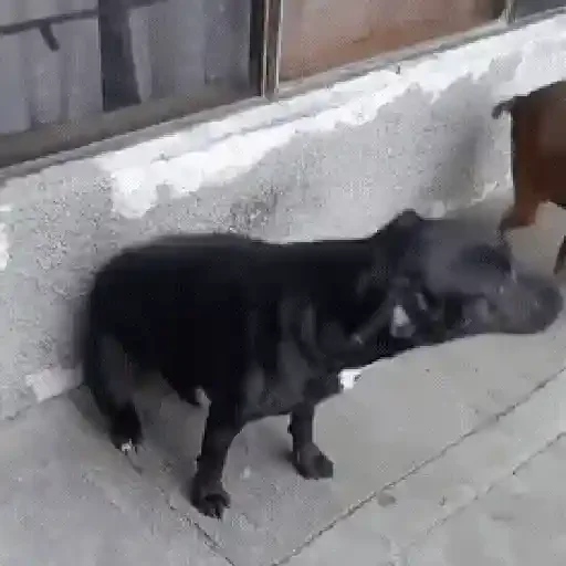 Cachorro preto com focinho grande, orelhas caídas e um pouco de branco nas patas, em pé em frente a uma parede cinza com janela.