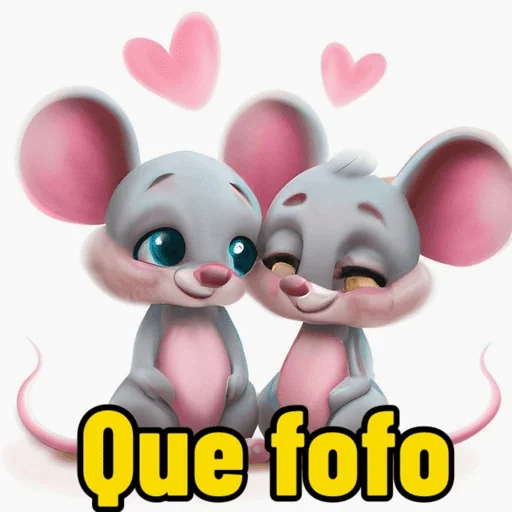 Dois ratinhos cinzas com orelhas rosa e olhos grandes se beijando, com dois corações rosa acima deles. Abaixo, o texto 'Que fofo' em amarelo.