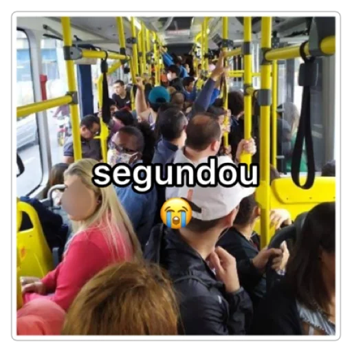 Pessoas sentadas em um ônibus lotado com o texto 'segundou' sobreposto.