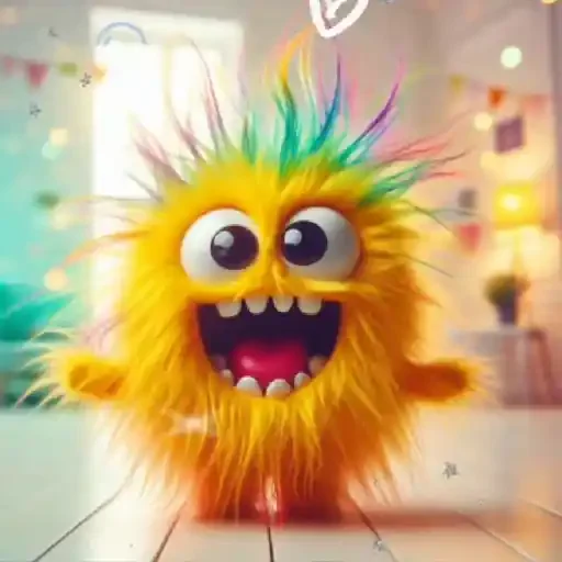 Um monstro amarelo fofo com cabelos coloridos e olhos grandes está com a boca aberta, mostrando os dentes. Ele parece feliz e engraçado.