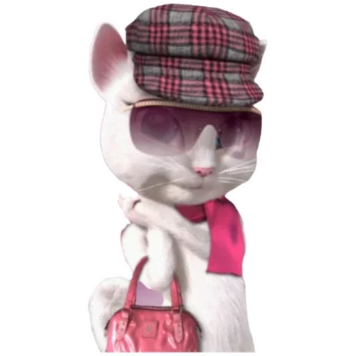 Gato branco usando óculos de sol, chapéu xadrez e bolsa rosa. O gato parece relaxado e estiloso.