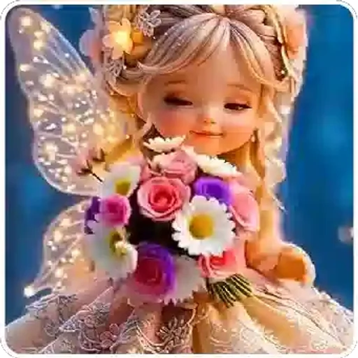 Uma fada com asas brilhantes e cabelos loiros segurando um buquê de flores coloridas, incluindo rosas e margaridas.