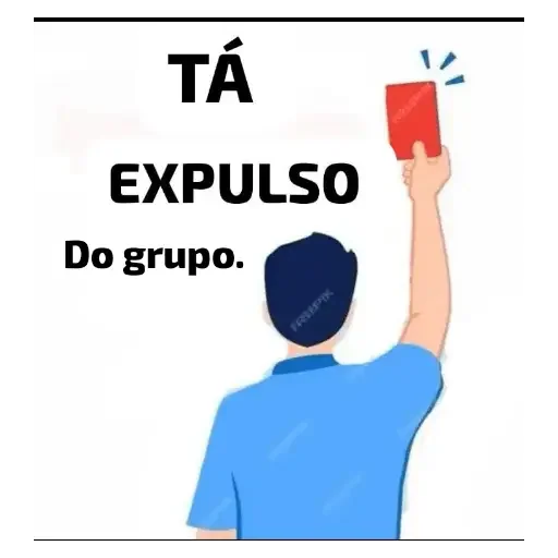 Um homem de costas, com camisa azul, mostrando um cartão vermelho e escrito 'TÁ EXPULSO Do grupo.'