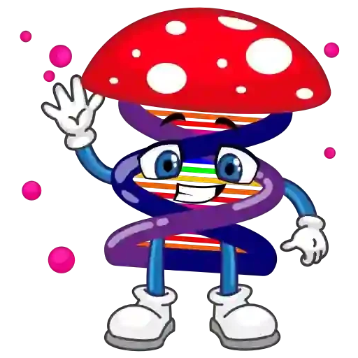 Um personagem de desenho animado, um cogumelo colorido com pernas e braços, acenando com a mão. O cogumelo tem uma tampa vermelha com manchas brancas e o corpo em tons de roxo com listras coloridas.