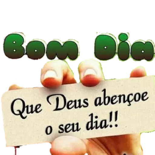Uma mão segurando um cartão com a frase 'Que Deus abenço e o seu dia!!' escrita em preto, com 'Bom Dia' em letras grandes verdes acima.