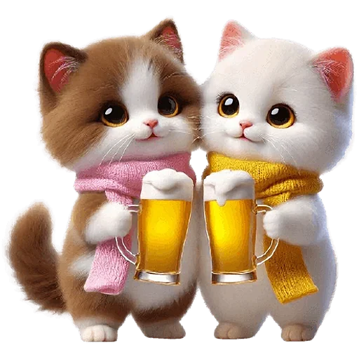 Dois gatinhos fofos, um castanho e branco e outro branco, usando cachecóis rosa e amarelo, respectivamente, e segurando canecas de cerveja.