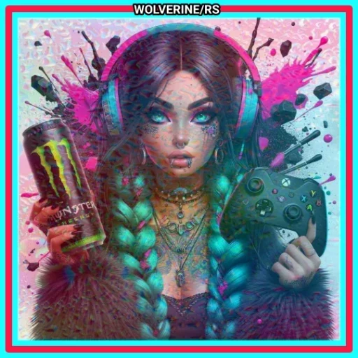 Uma mulher com cabelos longos e coloridos e maquiagem pesada, usando fones de ouvido e segurando uma lata de Monster e um controle de videogame. Ela está rodeada de efeitos de cores rosa e azul.
