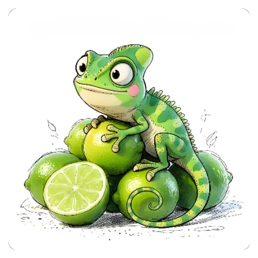 Um camaleão verde claro com olhos grandes e rosados nas bochechas está sentado em cima de limões, com um deles cortado ao meio na frente.