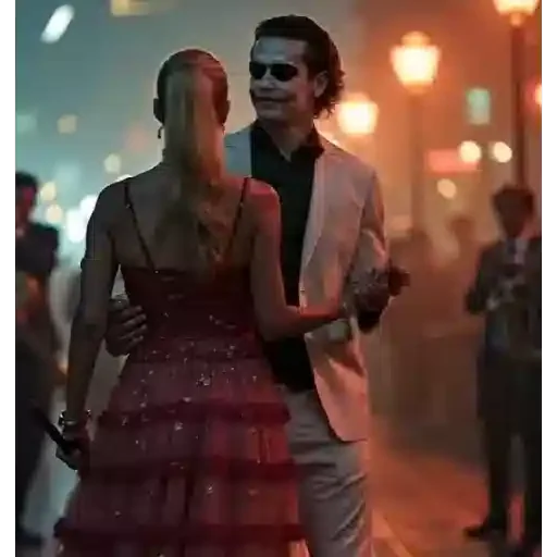 Casal caminhando à noite, ele com maquiagem de coringa e ela com vestido vermelho. O homem tem um braço ao redor da cintura dela.