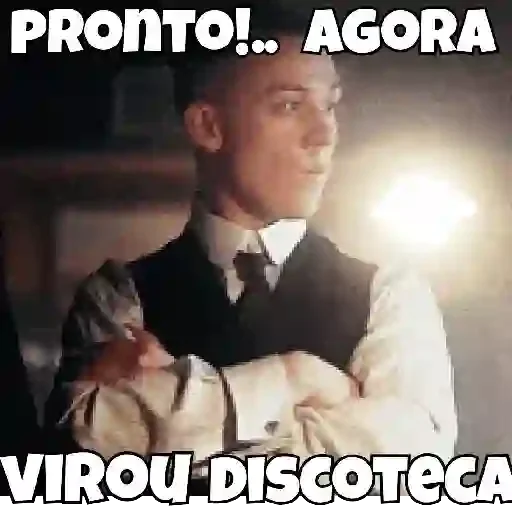 Homem com expressão séria e braços cruzados, vestindo terno e gravata, com texto "PRONTO!... AGORA VIROU DISCOTECA" sobreposto.