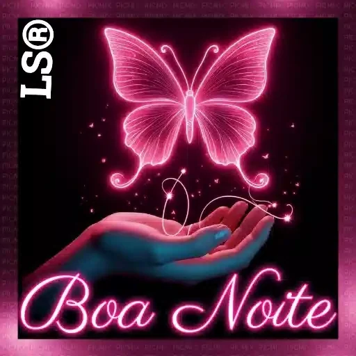 Uma mão com uma borboleta rosa neon saindo de suas mãos, com o texto 'Boa Noite' em letras rosa neon.