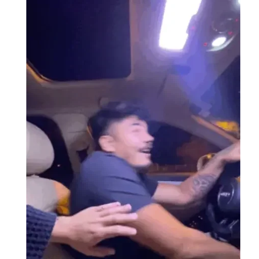 Homem dentro de um carro com expressão de susto ou surpresa, mão no volante e outra mão sendo colocada em suas costas.