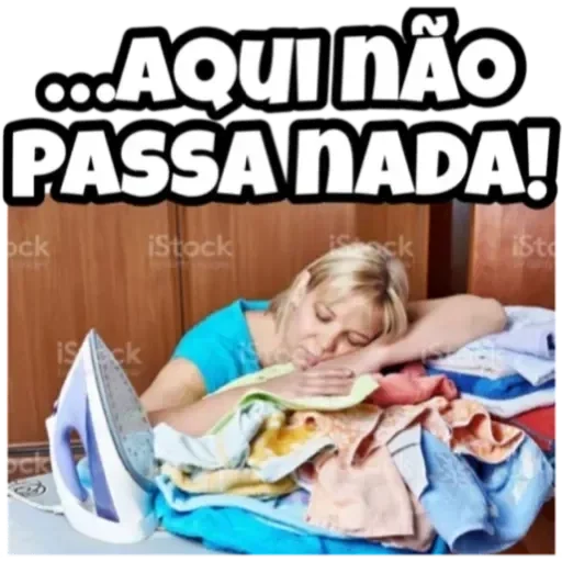 Uma mulher deitada em uma pilha de roupas, com um ferro de passar ao lado, e a expressão '...AQUI NÃO PASSA NADA!' em letras grandes.