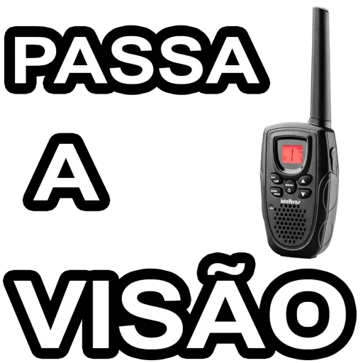 Um rádio de mão preto com uma tela vermelha e uma antena, ao lado do texto "PASSA A VISÃO" em letras grandes e brancas com contorno preto.