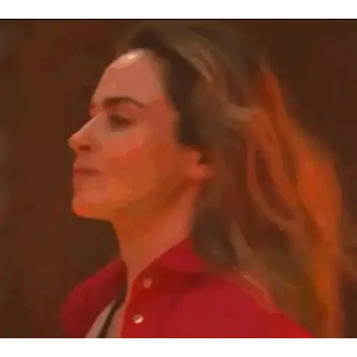 Mulher de cabelos castanhos e olhos fechados, vestindo uma camisa vermelha, com chamas ao fundo.