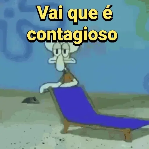 O personagem Squidward, de desenho animado, está sentado em uma cadeira de praia azul, com expressão facial de desaprovação ou desgosto. Ele tem um texto amarelo acima dele que diz 'Vai que é contagioso'.