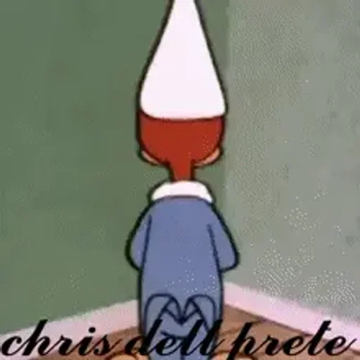 Um personagem de desenho animado com uma cabeça em forma de cone, vestindo uma camisa azul e com as costas viradas. A imagem contém o texto 'chris dell frete' na parte inferior.