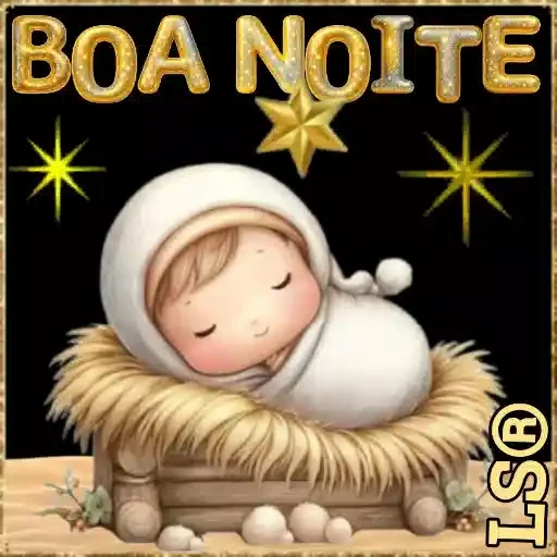 Um bebê deitado em um berço de palha com estrelas brilhantes no céu noturno, com a frase 'BOA NOITE' escrita em letras douradas.