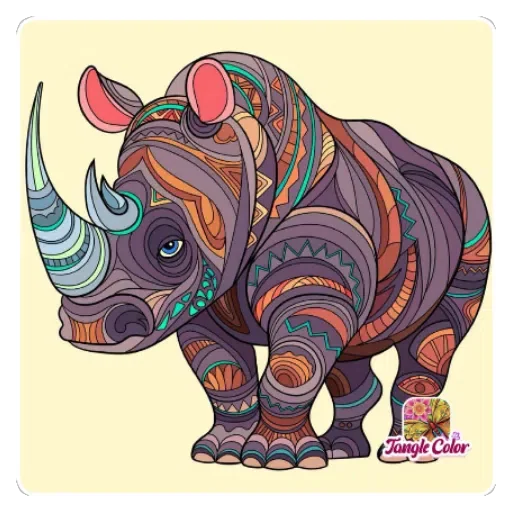 Um rinoceronte colorido com padrões e listras em tons de roxo, laranja, verde e rosa, com um chifre grande e orelhas rosadas.