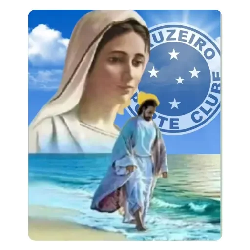 Imagem de Nossa Senhora com uma representação de Jesus Cristo ao fundo, em uma praia, com um círculo azul e estrelas ao lado. O texto 'UZEIRO TE CLURE' aparece no círculo.