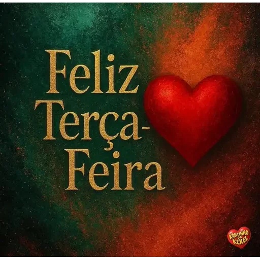 Um coração vermelho ao lado do texto 'Feliz Terça-Feira' em letras douradas, sobre um fundo verde e laranja.