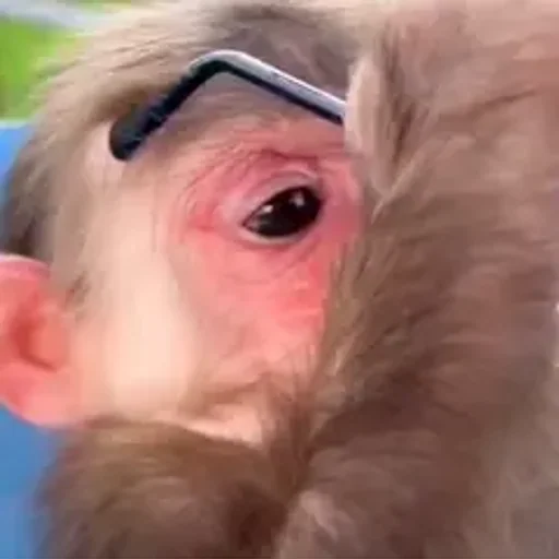 Macaco com um óculos de sol na testa, olhando para o lado com um olhar curioso.