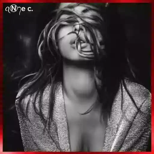 Uma mulher com cabelo longo e roupa cinza, parecendo extasiada ou em êxtase, com a mão cobrindo a boca. Fundo escuro.