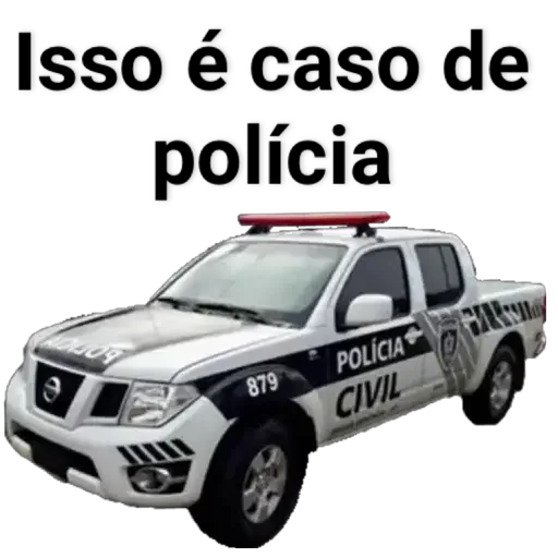 Um carro de polícia civil branco com luzes vermelhas em cima, com o texto 'Isso é caso de polícia' acima.