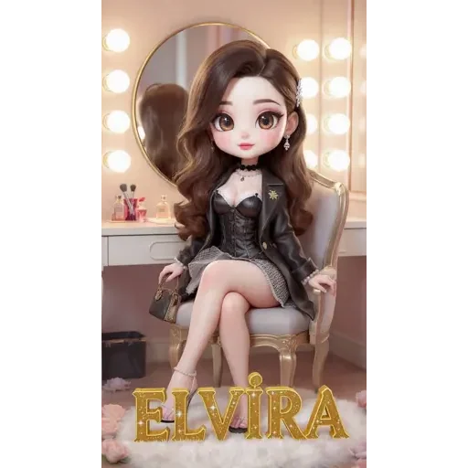 Boneca de estilo anime sentada em uma cadeira diante de um espelho com luzes, vestindo um conjunto de couro preto e saia cinza. O nome 'ELVIRA' aparece em letras douradas abaixo dela.