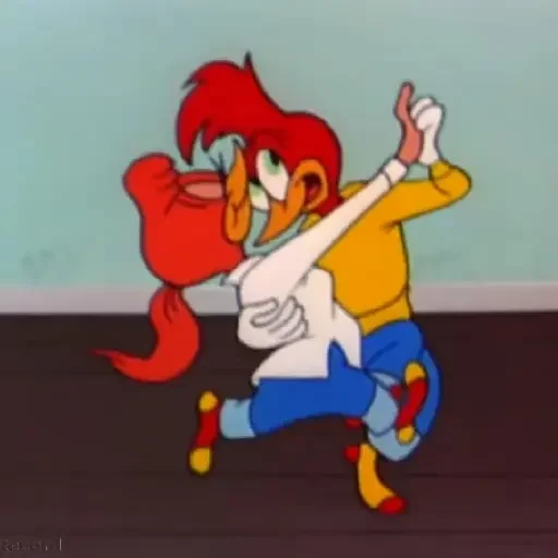 Personagem de desenho animado, pica-pau com cabelo vermelho e roupa azul, com expressão feliz e mão na parede.