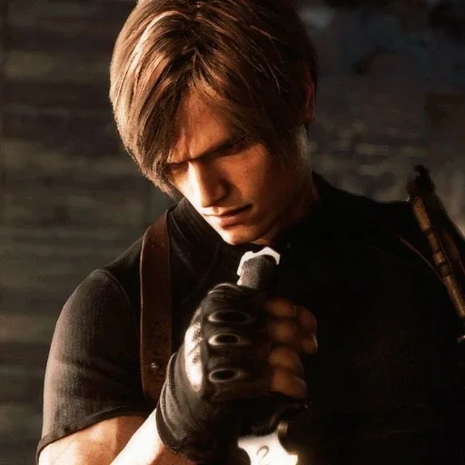Personagem de jogo com cabelo castanho e expressão séria, vestindo uma camisa preta e uma alça marrom.