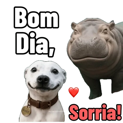 Um cachorro branco com um colar castanho e uma medalha dourada ao lado de um hipopótamo cinza, com o texto 'Bom Dia,' e 'Sorria!' e um coração vermelho.