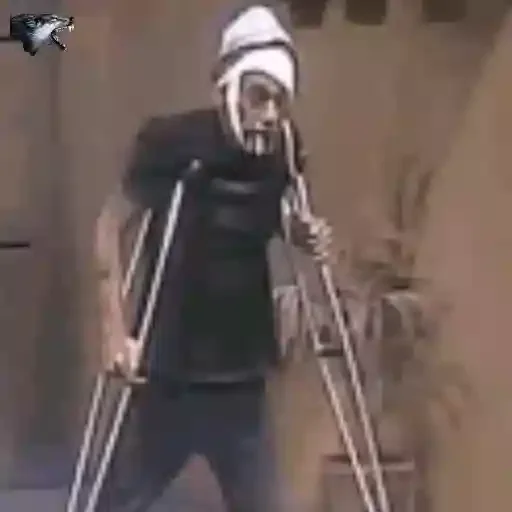 Um homem com uma máscara de esqueleto e um gorro branco está usando muletas, vestindo uma camiseta preta e calça jeans.