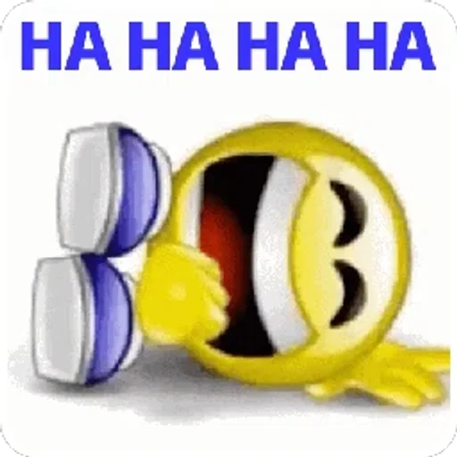 Um emoji amarelo com uma expressão de muito riso, com a boca aberta e olhos fechados, ao lado de dois DVDs ou CDs azuis e brancos. A imagem traz o texto 'HA HA HA HA' em azul.