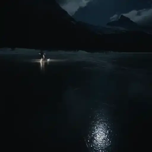 Cena noturna de uma pessoa em um barco em um lago com montanhas ao fundo, com reflexos de luz na água.