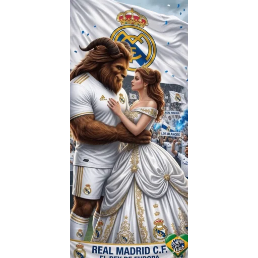 Um casal dançando, o homem com características de lobo e vestindo uniforme do Real Madrid, e a mulher com vestido de gala, em frente a uma bandeira do Real Madrid.