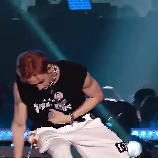 Homem com cabelo ruivo, usando um casaco preto e calça branca, com um microfone na mão, em um palco com luzes azuis.