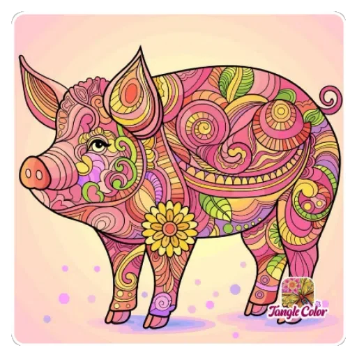 Um porco colorido com padrões florais e espiralados em tons de rosa, amarelo, verde e laranja. O porco tem uma flor amarela no peito.