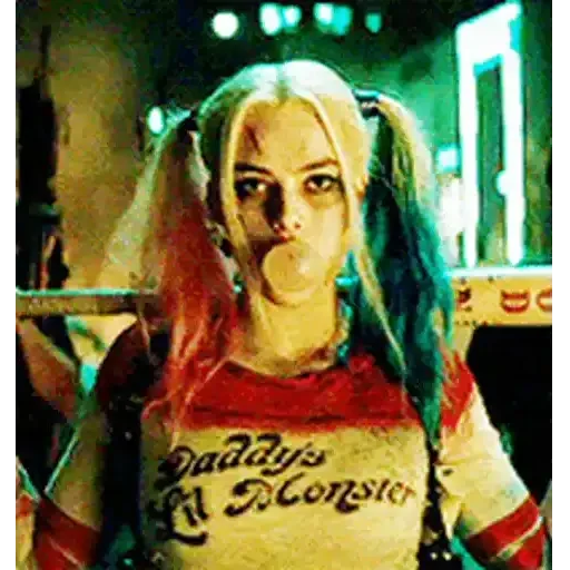 Harley Quinn com um olhar sério, cabelo loiro com pontas coloridas, vestindo uma camisa vermelha e branca com a frase 'Daddy's Lil Monster' escrita no peito.