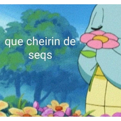 Um elefante azul com um tronco amarelo cheira uma flor rosa com o texto 'que cheirin de seqs' sobreposto.